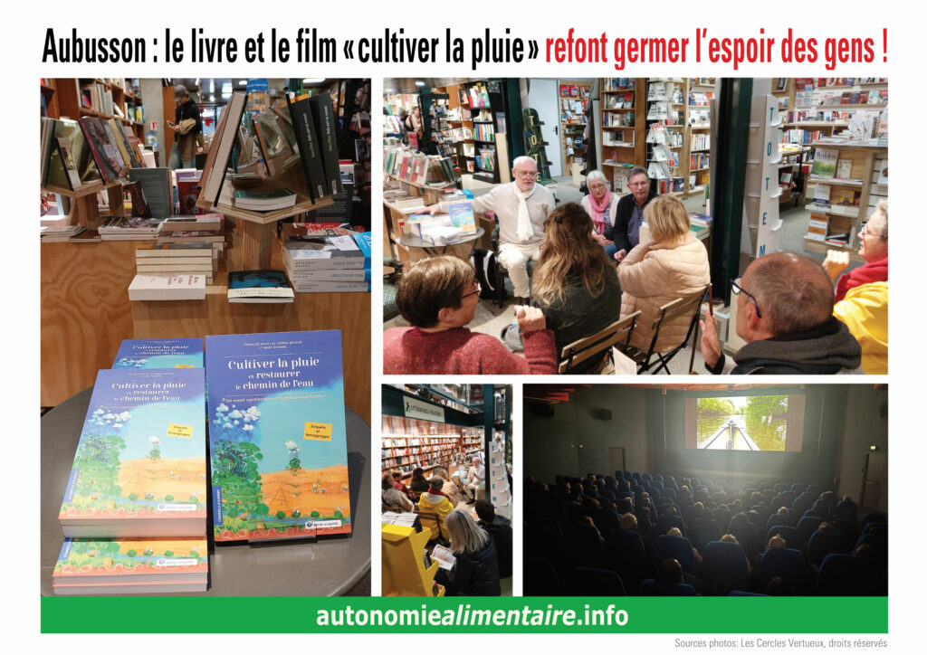 Les gens ont été enchantés, ravis, même étonnés en découvrant le film « Cultiver la pluie » de Marc Khanne témoigne Françoise de la librairie La Licorne à Aubusson. Oui, c’est un succès qui fait du bien de voir autant de monde venir au cinéma pour regarder un film documentaire à caractère agroécologique. Les échanges ont commencé à la librairie qui organisait ce samedi 4 octobre 2025 une rencontre dédicace avec les auteurs à l’occasion de la sortie du livre « Cultiver la pluie et restaurer le chemin de l’eau » paru tout récemment aux éditions Terre vivante.