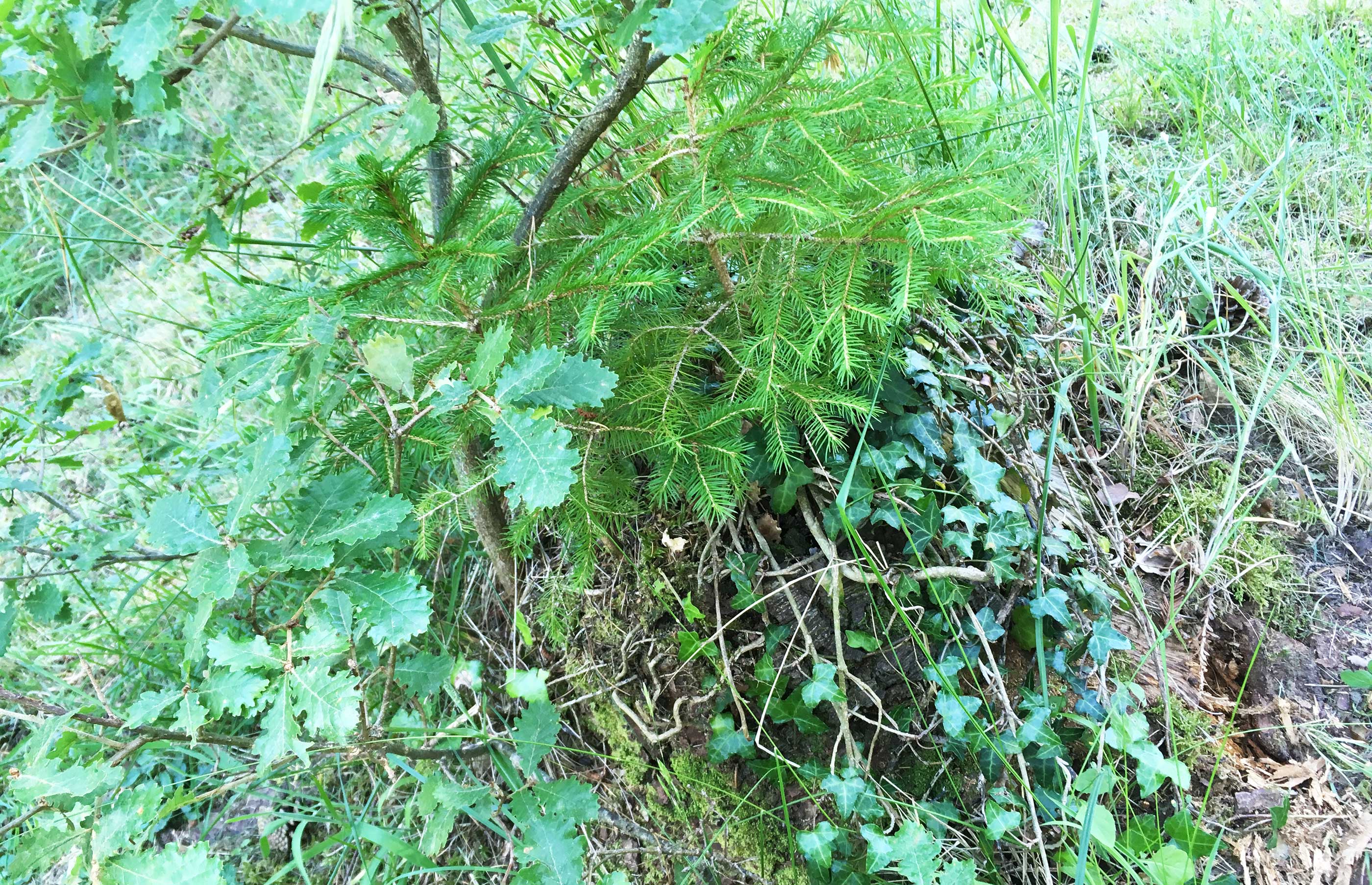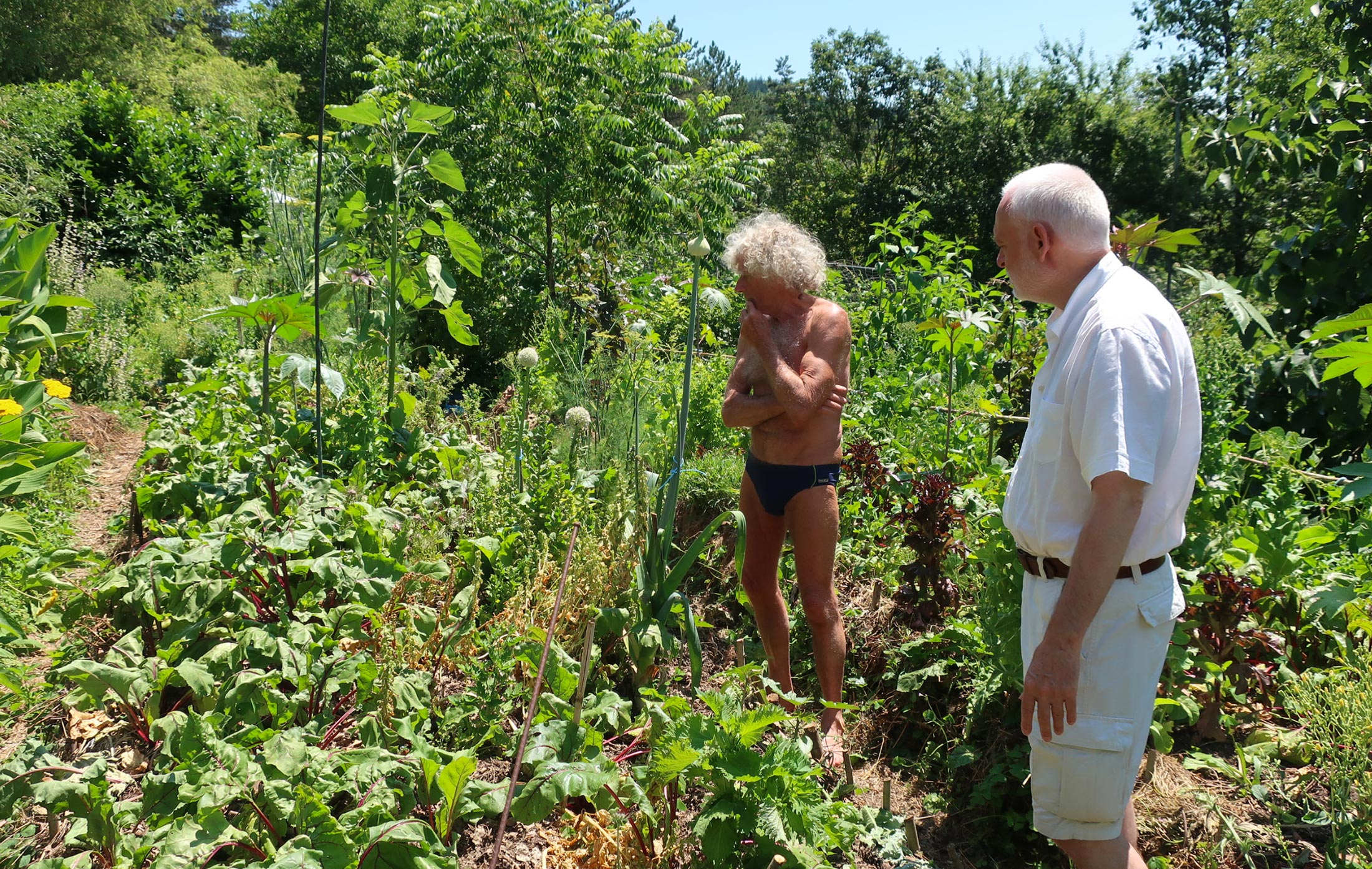 2) Le second mystère à éclaircir pour moi a été la question de l’arrosage, comment est-ce possible ? Philip Forrer n’arrose pas son jardin en été, jamais, sauf quand il met des semis en terre ou qu’il repique des plants et que le sol est sec. Sinon, pas une goutte. Là, franchement, il faut le voir pour le croire. Je suis resté deux jours sur place à observer en plein mois de juillet sous un soleil de plomb, et à aucun moment il n’y a une action d’arrosage. Le secret se trouve dans le bois en décomposition. Nous nous rendons au fond du jardin où Philip nous montre la souche d’un arbre qu’il a coupé il y a plusieurs années de cela. Le bois est en état de décomposition avancé. Et qu’est-ce qu’on observe ? Il y a un jeune chêne qui pousse sur cette souche ainsi que plusieurs petits plants de sapins qui sont venus se fixer sur cette réserve nutritive. Or, effectivement, les jeunes arbres continuent de croître et il n’y a pas d’action de l’homme pour arroser. Et ceci est une loi dans la forêt, même en Afrique, les arbres poussent sans intervention humaine. Il s’agit bien de la seconde clé aux questions que je me posais, les réponses à nos pratiques de jardinages sont dans la nature qui est notre enseignante. Par conséquent, il y a toute une attention à porter sur la structure même de la butte auto-fertile avec son bois en décomposition qui se trouve à l’intérieur. Beaucoup de débutants en permaculture enfouissent des branches constituées de bois « mort ». Or souvent, ce bois est sec et il reste sec au fond de la butte. Philip, pour sa part, utilise des troncs d’arbres en état de décomposition avancée, ces bois sont humides et ils le restent au fond de la butte. Les légumes viennent ainsi puiser dans cette ressource leur besoin en eau et en nutriments, cela stimule leurs racines qui se développent en profondeur pour que la plante puisse résister au manque d’eau.