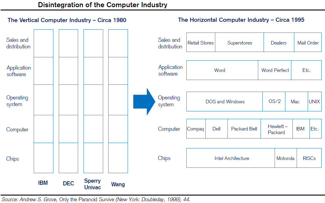 Commentaires – Premier cas, la vision de Andrew Grove, fondateur de la société Intel Corporation (Prix Harvard, L’Expansion 1985), dans son ouvrage traduit en français « Seuls les paranoïaques survivent » : la structure vertical de l’industrie informatique des années 80 est désintégrée en structure horizontale vers les années 95.