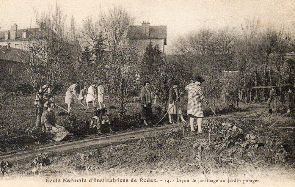 Exemple de l’école normale d’institutrices de Rodez en 1900, les futurs enseignantes prennent des cours de jardinage pour transmettre la connaissance aux enfants. L’apprentissage du jardinage pour cultiver la nourriture fait partie de l’enseignement scolaire dans tous les établissements filles et garçons.