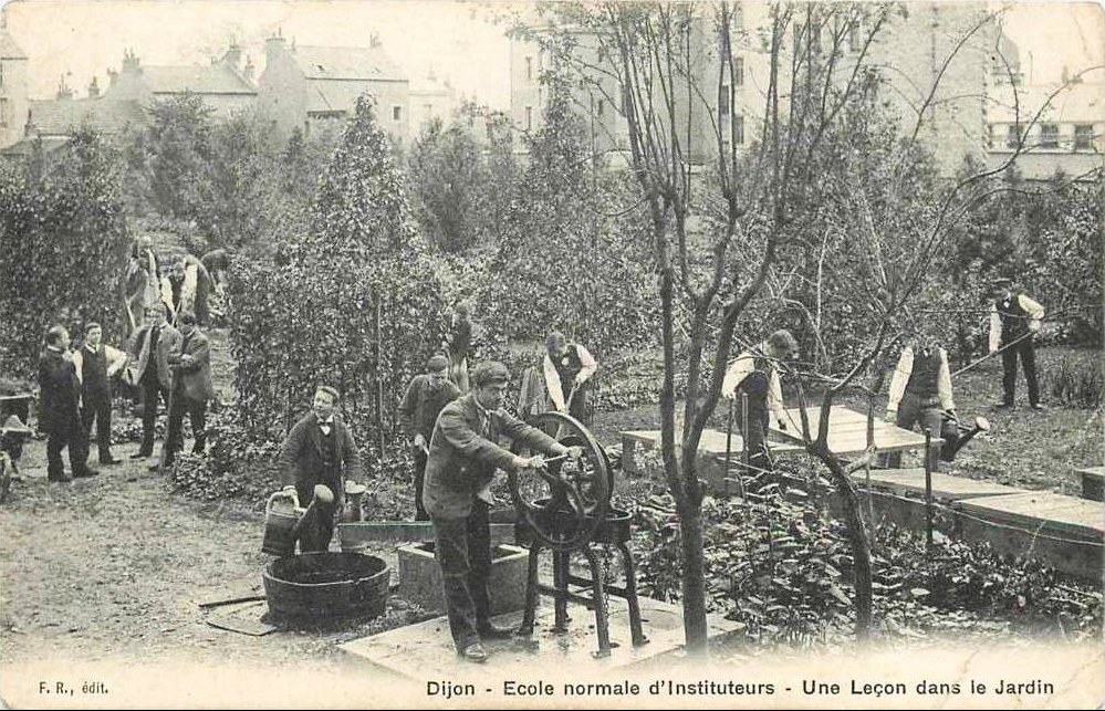 Exemple de l’école normale d’instituteurs de Dijon avec illustration d’une leçon de jardinage pour les futurs instituteurs qui apprennent aussi bien à faire des semis sous couches chaudes, qu’à cultiver les légumes et tailler les arbres fruitiers.