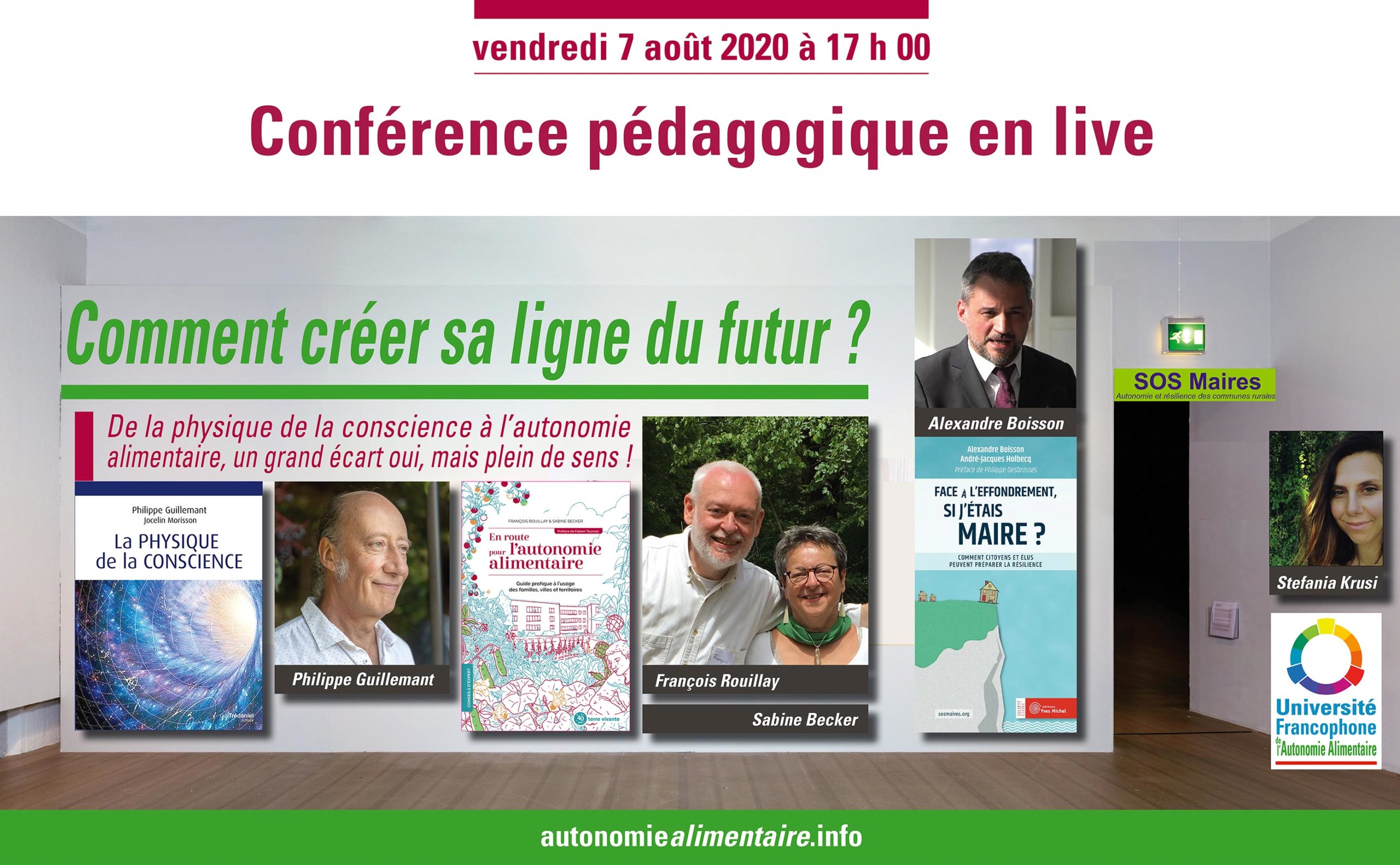 Vendredi 7 août 2020 à 17 heures, conférence pédagogique en direct live sur ZOOM avec pour thème « De la physique de la conscience à l’autonomie alimentaire – un grand écart oui, mais plein de bon sens ». Cette conférence conférence se déroule avec Philippe Guillemant, ingénieur physicien français diplômé de l’École Centrale Paris et de l’Institut de Physique du Globe, dans un échange avec Sabine Becker, ingénieure-urbaniste et thérapeute énergéticienne en binôme avec François Rouillay, chercheur et formateur en autonomie alimentaire des villes, tous les deux auteurs du livre « En route pour l’autonomie alimentaire » paru aux éditions Terre vivante en janvier 2020 et co-fondateurs de l’Université Francophone de l’Autonomie Alimentaire, sous l’impulsion d’Alexandre Boisson, fondateur de SOS Maires. Échange animé sous l’impulsion d’Alexandre Boisson, fondateur de SOS Maires avec Stefania Krusi, apicultrice bio, en soutien pour assurer les fonctions de modération. Page événement pour s’inscrire à la conférence, c’est EN LIEN ICI.