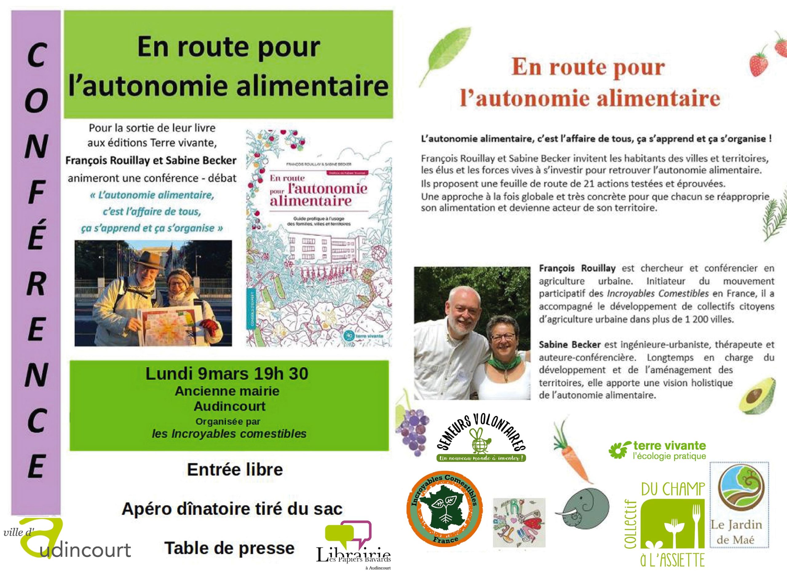 Lundi 9 mars 2020 dans la salle de mariage de l’ancienne mairie d’Audincourt, conférence « En route pour l’autonomie alimentaire » à 19h30 sur invitation du collectif des Incroyables Comestibles de Montbéliard et l’association Tri pour Terre. Le livre sera proposé par la librairie « Les Papiers Bavards » en fin de séance avec dédicaces des auteurs.