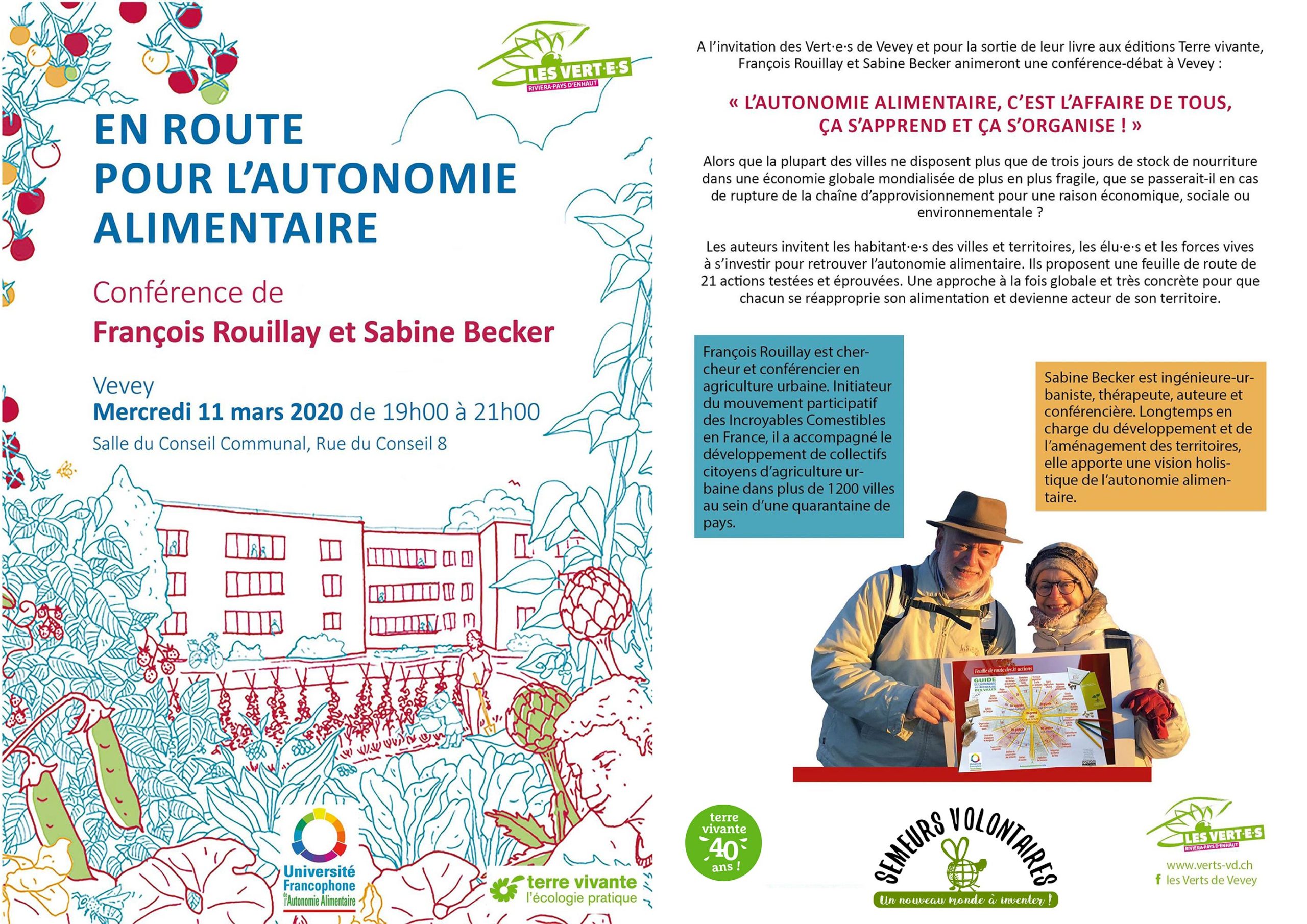 Mercredi 11 mars 2020, en Suisse, dans la salle du Conseil Communal de Vevey, conférence « L’autonomie alimentaire, c’est l’affaire de tous, ça s’apprend et ça s’organise ! » de 19h00 à 21h00 sur invitation des élus municipaux du Mouvement Écologiste Vaudois Les Verts.