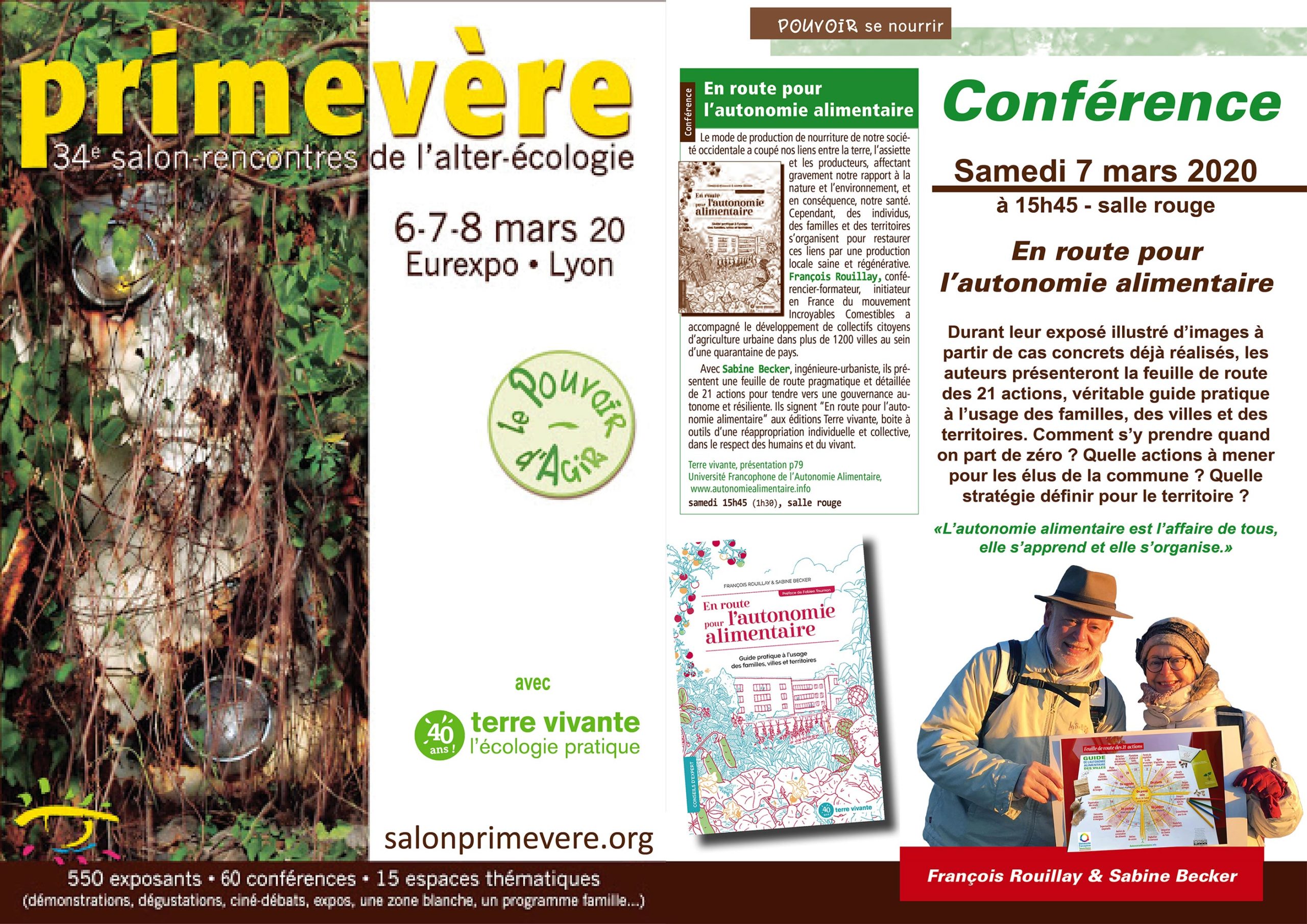 Samedi 7 mars 2020 au Salon Primevère à Lyon, conférence « En route pour l’autonomie alimentaire » à 15 h 45 – ANNULÉE Avec communication de l’éditeur : « De dernière minute… Terre vivante a décidé de ne pas participer au salon Primevère exceptionnellement cette année. Notre sens de la responsabilité collective nous oblige à respecter la directive gouvernementale et à prendre les mesures pour veiller à limiter la diffusion du virus sur le territoire. Nous ne tiendrons pas de stand et les conférences ont été annulées.😞 Nous vous remercions de votre compréhension. » L’équipe de Terre vivante